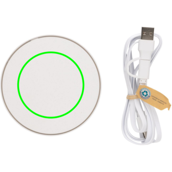Draadloze oplader van 10 W met dubbele connectorkabel (USB A en USB C) waarbij de behuizing is gemaakt van RCS-gecertificeerd gerecycled ABS-plastic en de draad van gerecycled TPE. Totaal gerecycled materiaal: 58% gebaseerd op het totale gewicht van het item. RCS (Recycled Claim Standard) is een norm om de gerecyclede materialen van een product in de hele toeleveringsketen te verifiëren. RCS is de standaard die wordt gebruikt wanneer een deel van het artikel is gemaakt van gerecyclede materialen. Draadloos opladen compatibel met de nieuwste Android-generaties, iPhone 8 en hoger. input 9V/1.5A. Draadloze output 9V/1.1A 10W. Artikel en accessoires PVC vrij. Inclusief 150 CM PVC-vrije gerecyclede TPE-kabel die verbinding biedt met zowel USB A- als type C-adapters.