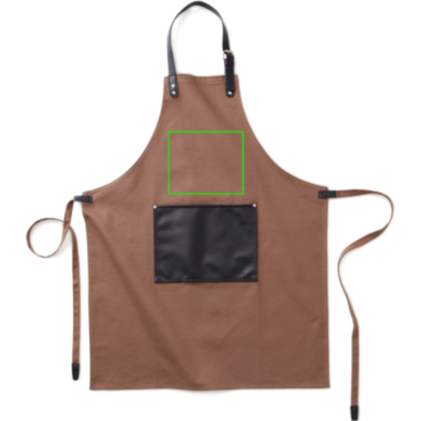 Stijlvol en klassiek schort van sterk katoenen canvas met discrete details van PU-materiaal. Verstelbare gesp aan de bovenkant en grote zak aan de voorkant. Een duurzaam schort dat met de tijd alleen maar mooier wordt.